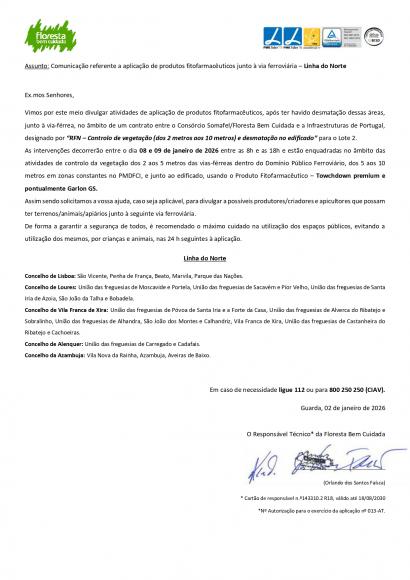 Comunicação referente a aplicação de produtos fitofarmacêuticos junto à via ferroviária - Linha do Norte