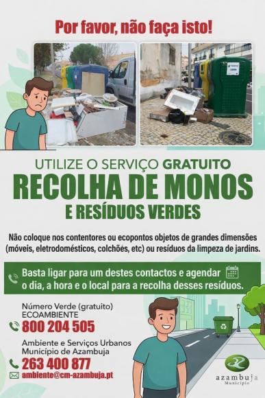 Recolha de monos e resíduos verdes Não coloque nos contentores ou ecopontos objetos de grandes dimensões ou resíduos de limpeza de jardins Serviço gratuito: 800 204 505 - Eco ambiente 263 400 877 - Ambiente e Serviços Urbanos do Município de Azambuja
