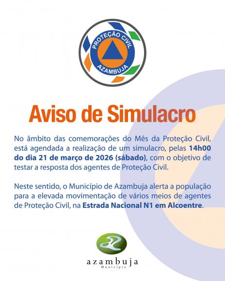 Aviso de Simulacro | 21 de março de 2026 Mais informações em: https://www.cm-azambuja.pt/informacoes/noticias/item/7607-municipio-volta-a-assinalar-marco-mes-da-protecao-civil-2026?fbclid=IwY2xjawQntHFleHRuA2FlbQIxMABicmlkETFNbGczcFlJaTZ6WTg1WTdKc3J0YwZhcHBfaWQQMjIyMDM5MTc4ODIwMDg5MgABHuPDUE8qCHogxXUprvrpCFzyhy_Msw4SMChqtDJ_Kv3og0hRtWJYtuhn-j6I_aem_BfKVVGi_MWZLAQmDYT_Q0Q