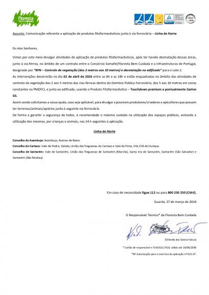 Comunicação referente a aplicação de produtos fitofarmacêuticos junto à via ferroviária - Linha do Norte